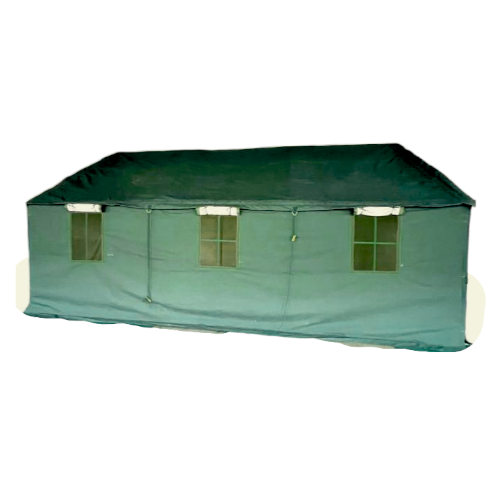 -Windows: 6 x windows; 3 on either side with mosquito netting and adjustable poly window closures for airflow- exterior is equipped with roll/tie down canvas coverings for inclement weather